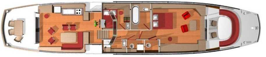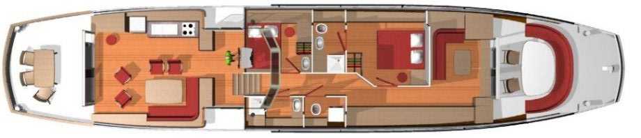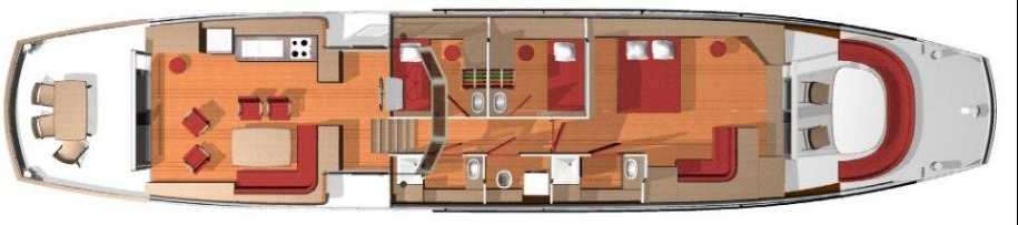 Dans cette version, la cabine propriétaire habite toute la partie avant, comme une suite, avec un lit 200x140, un grand bureau sur le côté tribord et de grands rangements sous le pont des deux côtés sous forme de commodes. Devant le lit, un grand espace détente est disponible, devant la baie vitrée. Cette cabine dispose d'une salle de bains propriétaire avec baignoire et meuble de toilette, et d'un WC séparé.